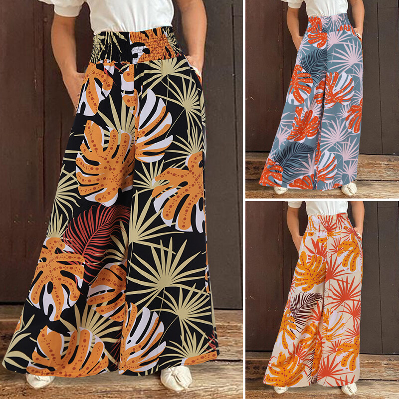 [Clearance Sale]ZANZEA Womens Trousers Palazzo Elastic High Waist Casual Loose Printed Long Pants CLE