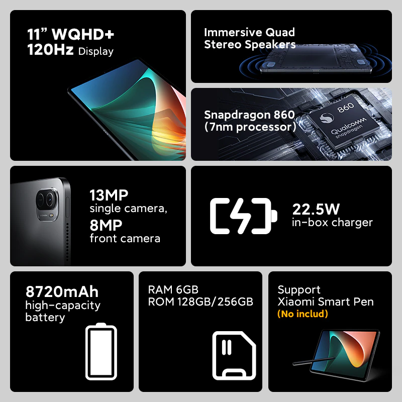 Package contents: Xiaomi Pad 5 / Adapter / USB Type-C Cable / Quick Start Guide / Warranty Card