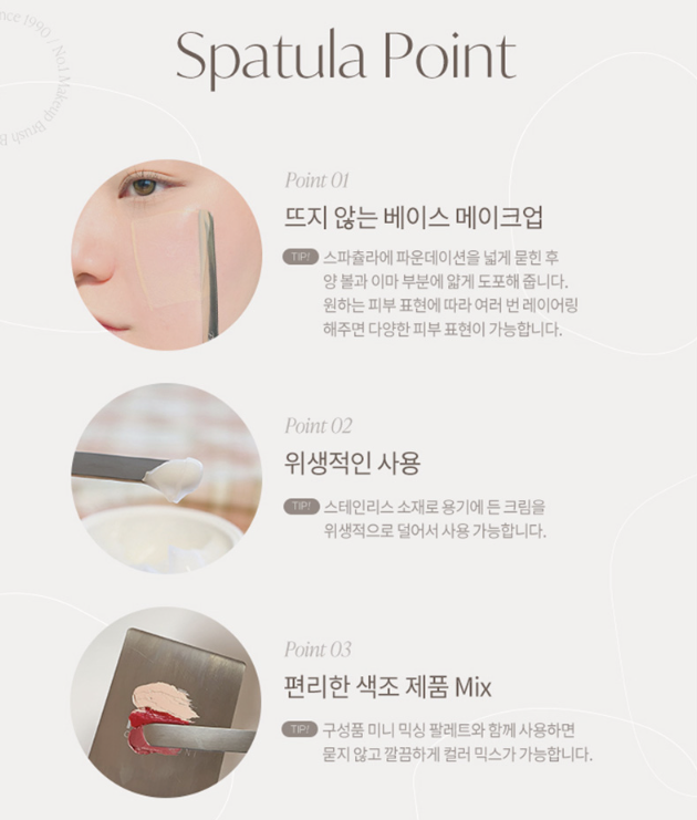- Apply the product at a 90-degree angle on the corner of the spatula and spread it thinly on the desired area, and use a sponge or brush to adhere to the skin. After using the spatula, wipe it clean and store it in the case