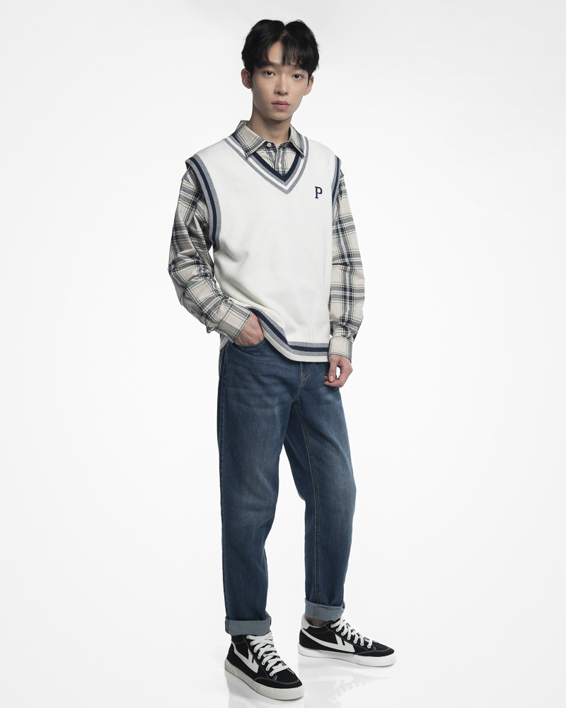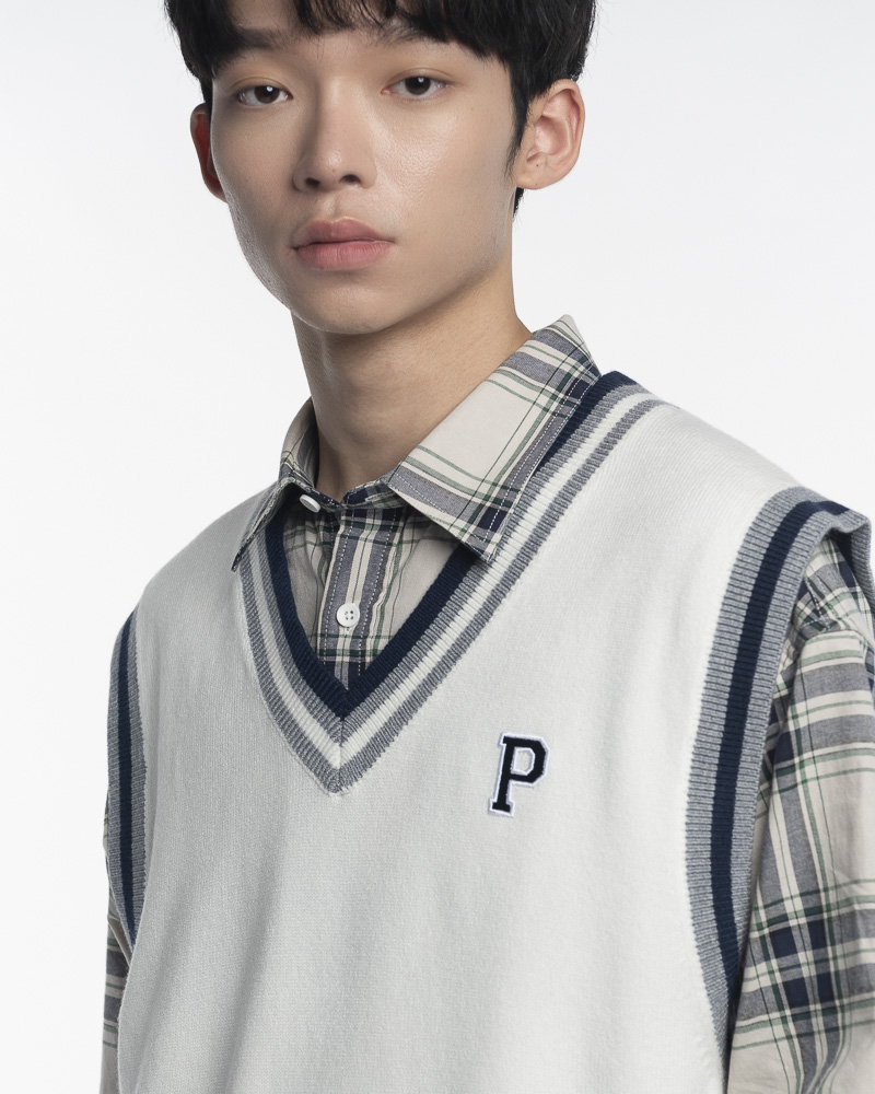 Regular Knitted Round V Varsity Vest With Asymmetrical Contrast Coloured Neckline and Hem. Comes with Letter P Embroidery at the front. Made of cotton.