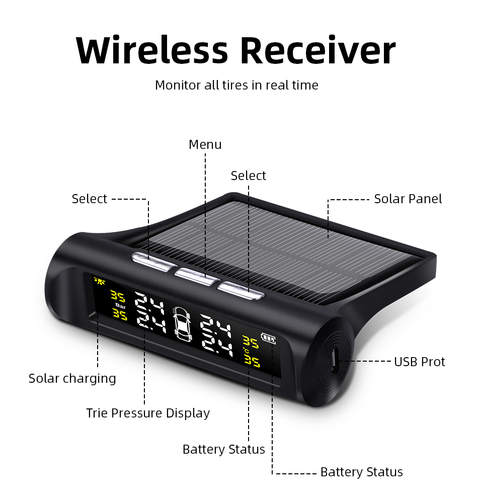 A: It is Tire Pressure Monitoring System and is also called Tire Pressure Sensor. Make alarm and show car tires' pressure and temperature.