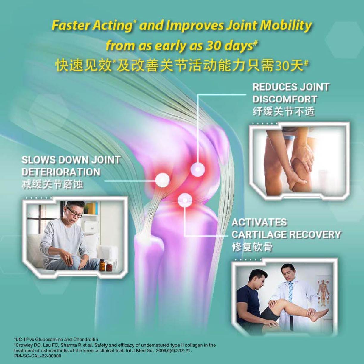 Caltrate Joint Health UC-II Collagen Supplement Tablet (2X More Effective vs Glucosamine + Reduce Joint Discomfort) 90s Support your joint health with the Caltrate Joint Health Undenatured Collagen Type II (UC-II). Caltrate Joint Health UC-II contains UC-II undenatured collagen type II, a patented ingredient that has been clinically tested to reduce joint discomfort and promote healthy cartilage and joint flexibility for healthier and longer active living. MAHS2000216 **Where applicable, items have a minimum of nine-month shelf life before expiry unless otherwise stated on product description.