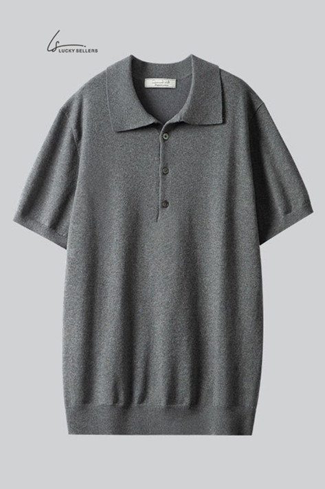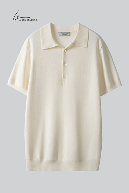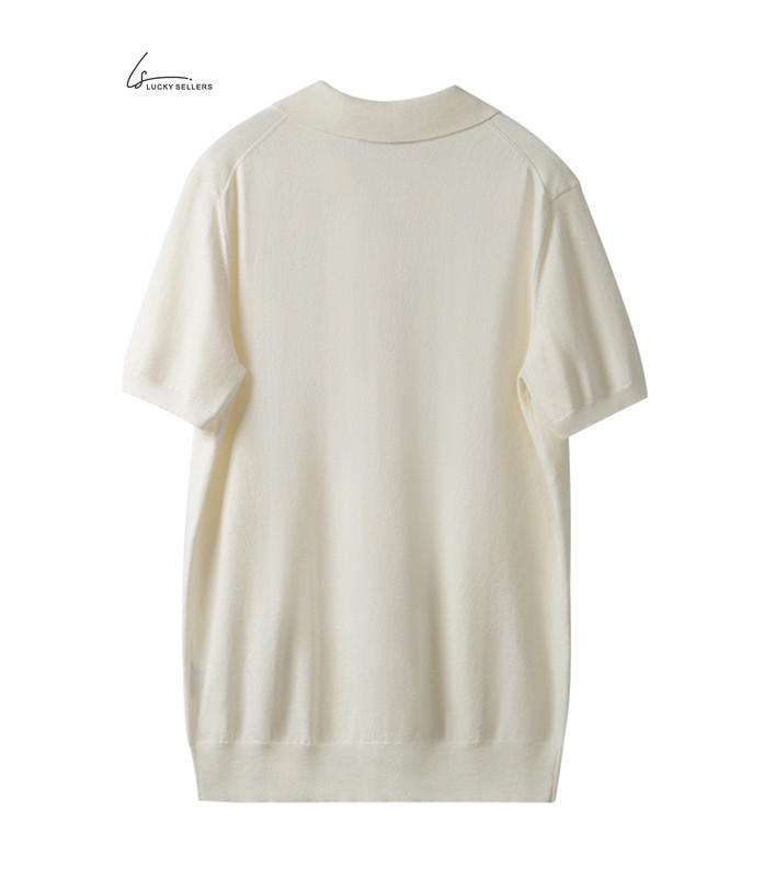 Lapel No Button 100% Cotton Ivory White Polo Shirt High-end Business Casual Slim Knit V-neck Short Sleeve Men's T-shirt