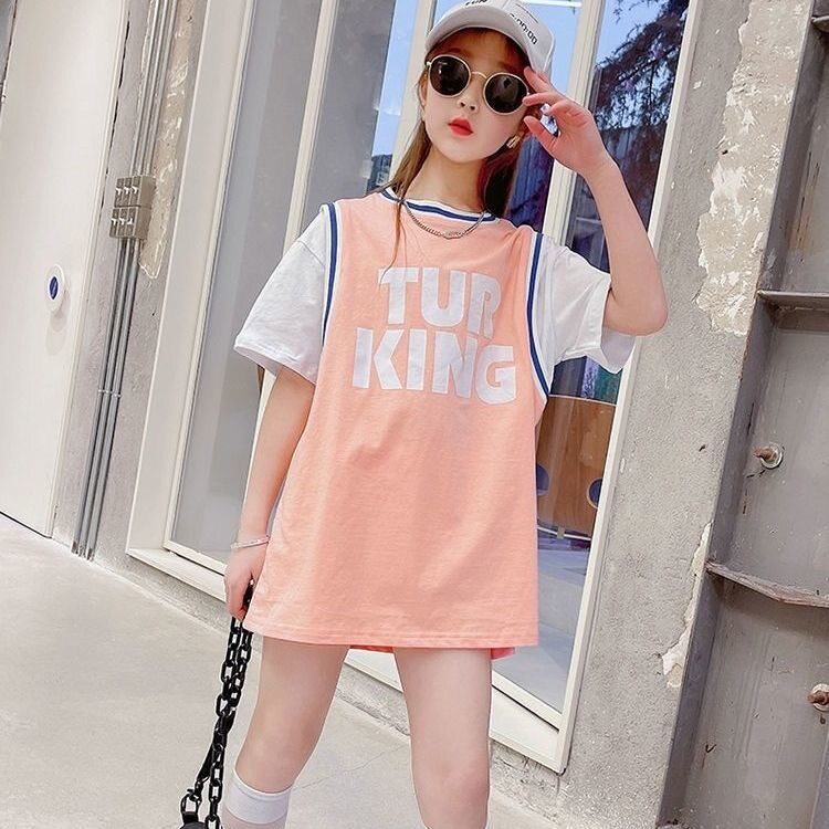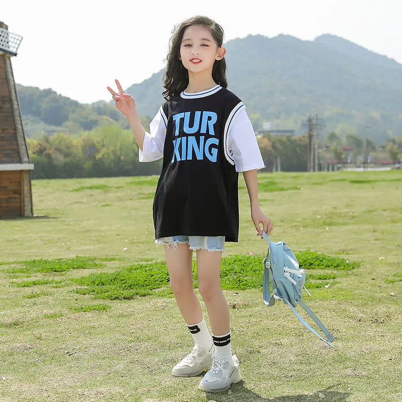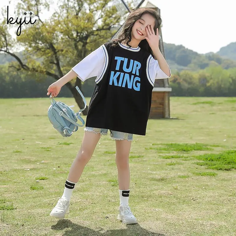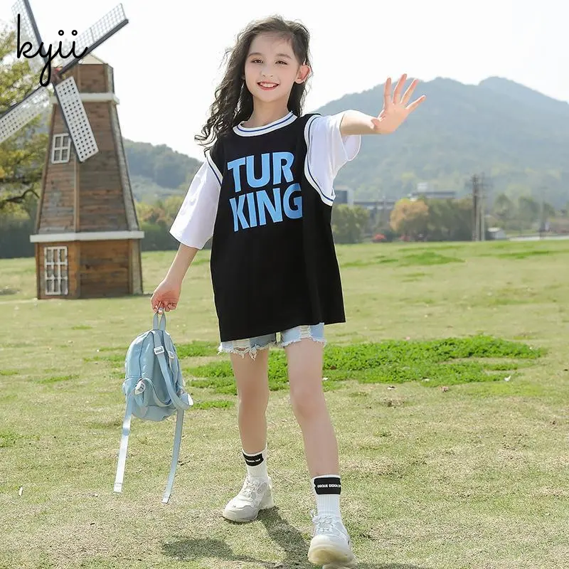 KYII Girls Summer Mid-length Short-sleeved letter Prnt T-shirt 2022New Korean Version Children Girls Dress ky011