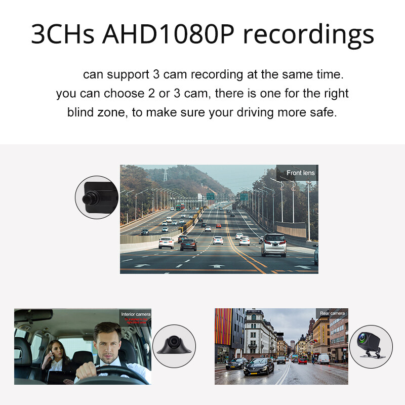 Three-way camera: 1080 front, 1080 rear, 1080 right view or in car