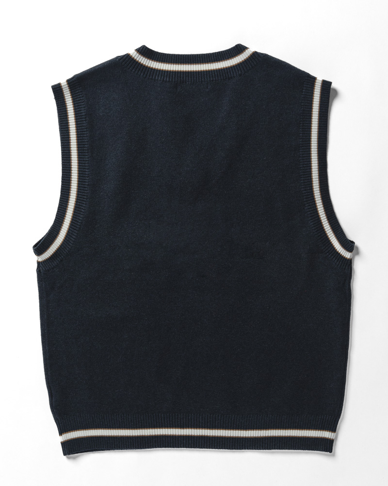 Regular Knitted V Neck Varsity Vest with Contrasting ColourNeckline and Hems. Comes with 'COURAGE' Slogan at the front. Made of cotton. Colours available: Dark Blue