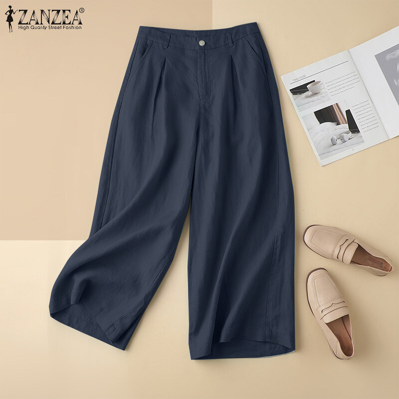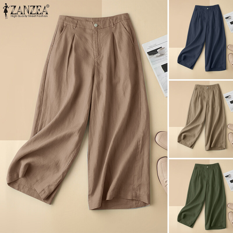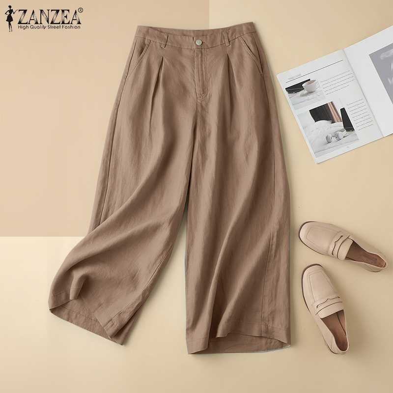 ZANZEA Womens Cotton Linen Wide Leg Long Pants Casual Pleated Solid School Trousers #2