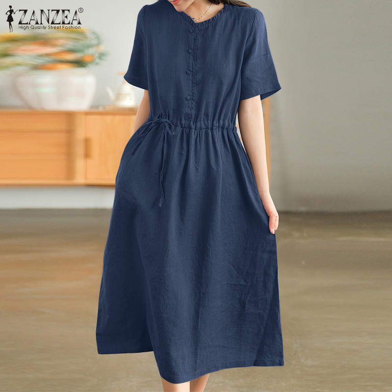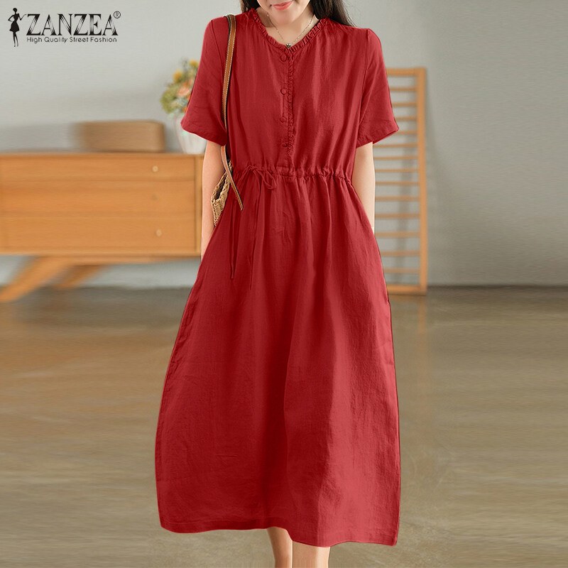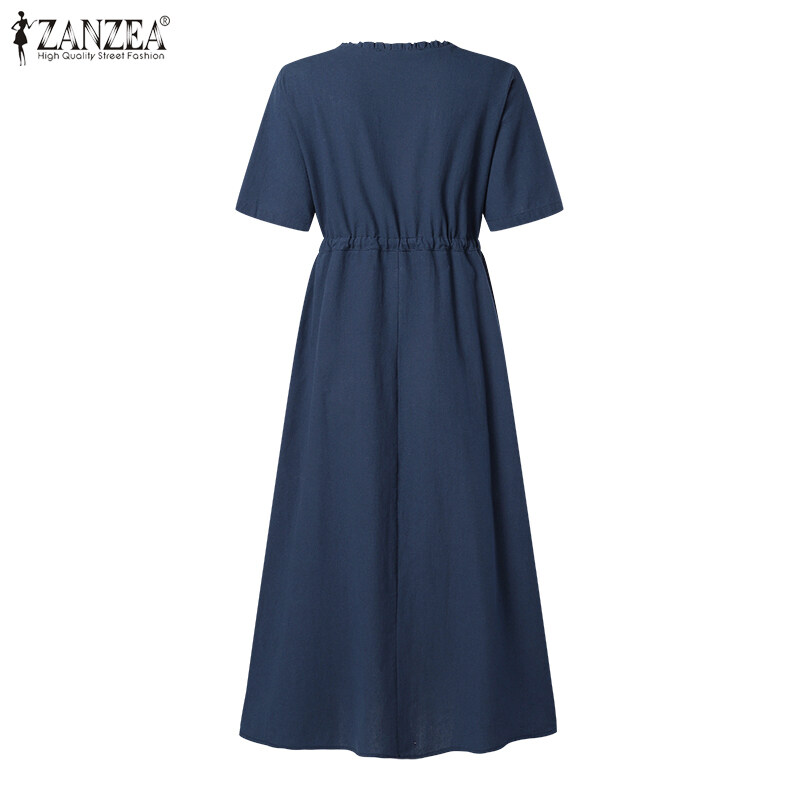 ZANZEA Korean Style Women Short Sleeve A Line Long Dress Cotton Linen Plain Oversized Swing Dresses #8
